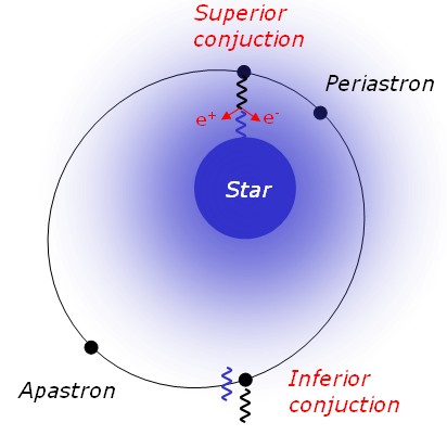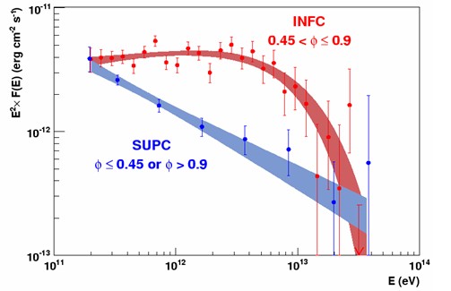 In 2004 and 2005, H.E.S.S. accumulated 69 hours of data on LS 5039, boosting the gamma-ray signal to 40 standard deviations above background. In the 160 observation runs, significant variability of the gamma-ray emission was immediately obvious. A periodicity analysis using the Lomb-Scargle test (Scargle 1982)- similar to a Fourier decomposition of the time-variable flux into its frequency components – shows a strong frequency component at a period of 3.908 days (Fig. 1), within errors consistent with the know orbital period of 3.906 days (Casares et al. 2005). The nearby source HESS J1825-137, observed simultaneously, showed no modulation, excluding any kind of instrumental artifact. Folding the measured light curve with the period results in Fig. 2, showing gamma-ray flux as a function of orbital phase. Orbital modulation is clearly visible. However, contrary to naive expectations, the maximum emission is not at periastron, but rather around the inferior conjunction, where the compact object and the star line up along the line of sight. Periastron – the closest approach – should provide the highest accretion rate onto the compact object, and the highest magnetic and photon fields, which should boost particle acceleration and gamma-ray production (unless radiative energy losses are so high that they prevent further acceleration). However, if gamma rays are created close to the compact object, then another effect becomes important: absorption of gamma rays in collisions with stellar photons (e.g.Böttcher and Dermer 2005,Dubus 2006,Bednarek 2006). When the compact object is “behind” the star, gamma rays and stellar photons collide head-on and can easily surpass the threshold for electron-positron pair production, resulting in a nearly 100% loss of high-energy photons (top figure; stellar photons are shown in blue and high-energy gamma rays in black). At the inferior conjunction, when the compact object is “in front”, gamma rays and stellar photons travel on parallel paths and cannot interact, therefore the flux maximum. However, this cannot be the full story. The modulation of the gamma-ray spectrum is strongly energy-dependent (Fig. 3): around 200 GeV and 30 TeV, the flux does not vary strongly with orbital phase, whereas at a few TeV, variation is as large as a factor 5. Absorption alone, however, should generate a significant modulation already at 200 GeV. It seems that – not quite unexpectedly – orbital variation of the particle acceleration partly compensates for the absorption and results in a complex, energy-dependent flux modulation. Recent articles which discuss gamma-ray production mechanism and give further references are e.g.Bosch-Ramon et al. (2006),Paredes et al. (2006),Gupta et al. (2006) andDermer and Böttcher (2006). Besides the leptonic origin discussed in these papers, also hadron acceleration has been considered (e.g. Aharonian et al. 2006, in press, Bosch-Ramon et al. 2006)