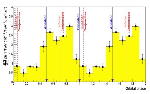 One year ago, in August 2005, the microquasar LS 5039 (top figure) was featured as source of the month. Novel exciting results on this source merit a renewed discussion, despite the many other H.E.S.S. sources which await presentation. LS 5039 was the first microquasar established as a high-energy gamma-ray source (Aharonian et al. 2005), more recently followed by LS I +61 303 (Albert et al. 2006) as a second example. Such binary systems with eccentric orbits provide a unique laboratory to study how particle acceleration and propagation vary with the changing environment along the orbit. Orbital X-ray variability of LS 5039 was indeed reported byBosch-Ramon et al. (2005). Variation of high-energy gamma-ray emission from binaries has been observed on sections of the 3.4-year orbit of the binary pulsar PSR B1259-63/SS 2883 by H.E.S.S. (April 2005) and along the 26 day orbit of LS I +61 303 by MAGIC (Albert et al. 2006). With its 3.9 day orbit, LS 5039 now allows for the first time recording many periods and establishing periodic variation of the gamma-ray flux along the orbit.