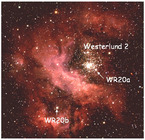 What is the origin of these gamma rays? With a projected angular size of milliarcsecond scale, the WR 20a binary system, including its colliding wind zone, would appear as a point source for observations with the H.E.S.S. telescope array. Unless there are extreme differences in the spatial extent of the particle distributions producing radio, X-ray, and VHE gamma-ray emission, scenarios based on the colliding stellar winds in the WR 20a binary system face the severe problem of accounting for a source extension of 0.2 degr. in the VHE waveband. At the nominal distance of WR 20a of 5.75 kpc, this source extension is equivalent to a diameter of about 20 pc for the emission region, consistent in size with theoretical predictions of bubbles blown from massive stars into the interstellar medium (Castor et al. 1975). Shocks and turbulent motion inside a bubblecan efficiently transfer energy to cosmic rays, providing a plausible mechanism for particle acceleration. In size and location, the gamma-rays source resembles the “blister” (Whiteoak & Uchida 1997) on the western side of Westerlund 2, where the bubble opens up and the wind expands into a low-density medium. Shock acceleration at the boundaries of the blister may enable particles to diffusively re-enter into the dense medium again, thereby interacting in hadronic collisions and producing γ-rays. Similar scenarios were outlined byVölk (1983) for a supernova-driven expansion of particles into a low density medium. If one accepts such a scenario here, it might give the first observational support of gamma-ray emission due to diffusive shock acceleration from supersonic winds in a wind-blown bubble created by WR 20a, or by the ensemble of hot and massive OB stars in Westerlund 2.