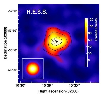 RCW 49 is a giant HII region – a cloud of ionized hydrogen – located towards the outer edge of the Carina arm of our Milky Way, at a distance of maybe 4-6 kpc. Embedded in RCW 49 is the open stellar cluster Westerlund 2. The region, with massive star formation, has been extensively studied at various wavebands, and is also an interesting target for gamma-ray observations. Chandra observations uncovered about 500 X-ray sources in the region (Townsley et al. 2004). A number of massive Wolf-Rayet stars have been found in RCW 49, among them WR 20a and WR 20b (Van der Hucht 2001,Shara et al. 1991). In 2004, WR 20a was recognized as a binary system of two Wolf-Rayet stars, with an orbital period of 3.7 days (Rauw et al. 2004,Bonanos et al. 2004,Rauw et al. 2005), and minimum masses of about 70 solar masses for each of the stars. WR20a is the most massive binary system known in our Galaxy. The massive hot Wolf-Rayet stars generate strong stellar winds, and stellar wind-blown bubbles around WR 20a (and the core of Westerlund 2) and around WR20b are clearly visible in infrared (Churchwell et al. 2004) and radio images (Whiteoak & Uchida 1997) of the region . Integrated over their lifetime, the wind energy output of Wolf-Rayet stars – some 1037 ergs/s – is not so far from the kinetic energy released in supernova explosions, and shocked winds are well suited to accelerate particles to high energy. This applies in particular to the region in between the two Wolf-Rayet stars in WR 20a, where their winds collide with relative speeds of order 1000 km/s. Massive binary systems are therefore likely sources of high-energy gamma rays, produced either by inverse-Compton scattering of accelerated electrons, or by acceleration of nuclei followed by collisions with ambient material and gamma-ray production via the decay of pions created in the collision (seeReimer, Pohl und Reimer 2006 and refs. given there, andBednarek 2005).
