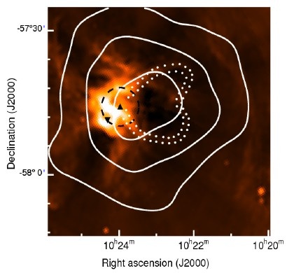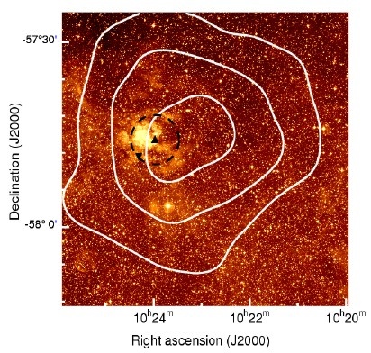 The RCW 49 region was target of H.E.S.S. observations in March through July 2006, also as part of the survey of the Galactic plane; about 13 h of good-quality data were obtained. In the vicinity of WR20a, a clear excess of VHE gamma rays is visible, see Fig. 1. The significance of the excess is about 9 standard deviations. Compared to the point spread function of the instrument, the source – termed HESS J1023–575 – appears slightly extended, corresponding to an intrinsic size of the gamma-ray source of about 0.2 degr.; its center (black point in Fig. 1) is slightly shifted compared to WR 20a and to the Westerlund 2 cluster. As expected for an extended source, the gamma-ray flux is steady over time. Fig. 2 and Fig. 3 show the gamma-ray source in relation to optical (B-band) and radio (843 MHz) images, respectively.