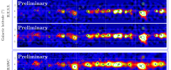 Figure 1 shows the lightcurve in the TeV- and GeV gamma-ray and the optical (eV) bands for the 2015-2016 period. Right from the start of the monitoring program PKS 1510-089 exhibited prominent flares. Throughout the first half of 2015 a number of bright outbursts were observed in the optical and GeV bands, but not in the TeV regime. On May 29 2016, however, H.E.S.S. observed the brightest VHE flux so far and alerted the community about this event. In the next night, May 30, the VHE flux increased even more, reaching fluxes more than 20 times brighter than the average value.The flare was significant in the GeV and optical bands as well, but the TeV emission was much more pronounced. Figure 2 shows the TeV-, GeV and the optical lightcurves of the extraordinary flare in 2016. MAGIC followed up the H.E.S.S. alert detecting the flare. During this prominent outburst intranight variability was observed in the TeV band which provides challenging constraints on the source model. In the same night. The combined H.E.S.S. and MAGIC lightcurve provides important clues about the mechanism that led to the event ([5]).