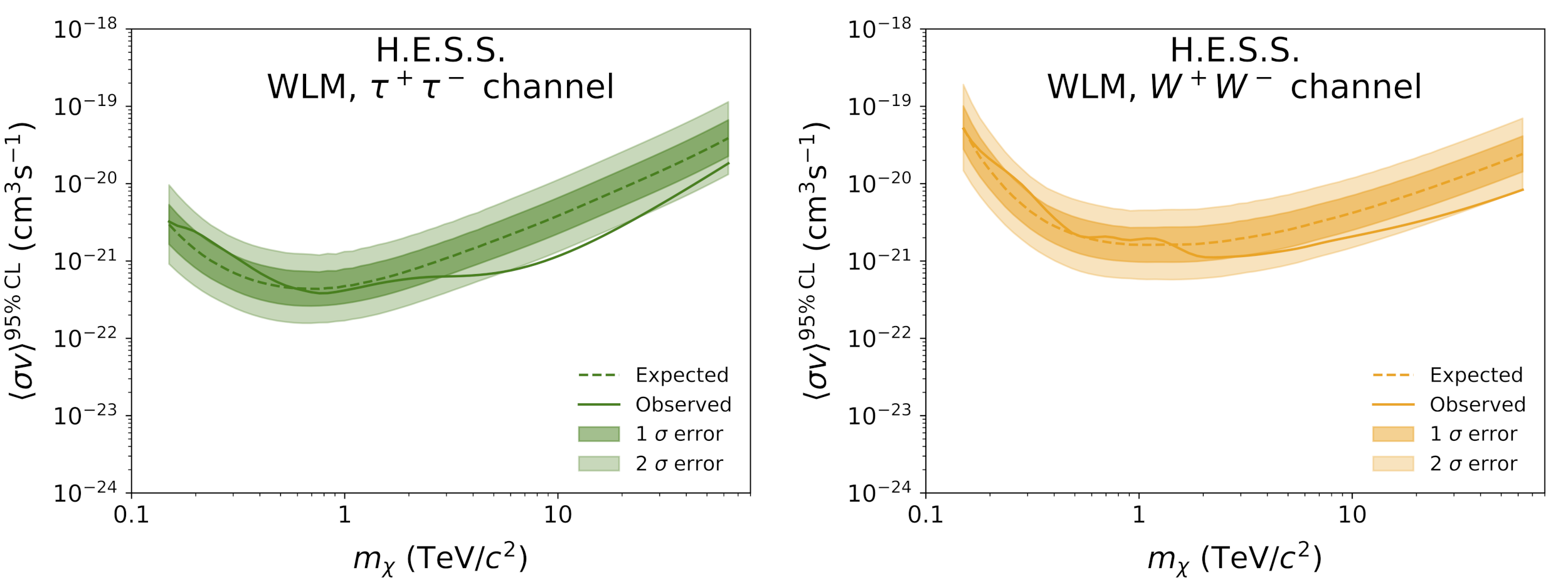 Figure 3 presents an example of upper limits in the case of an annihilation of the WIMP particles into the τ + τ – and W + W – channels. All values above the limits are considered forbidden, otherwise we would have detected dark matter, while all values below the limits are still allowed, as our telescope sensitivity does not allow us to explore more constraining values. The limits are expressed in term of the annihilation cross section <σv>, which is an indicator of the annihilation rate of the dark matter particles.
