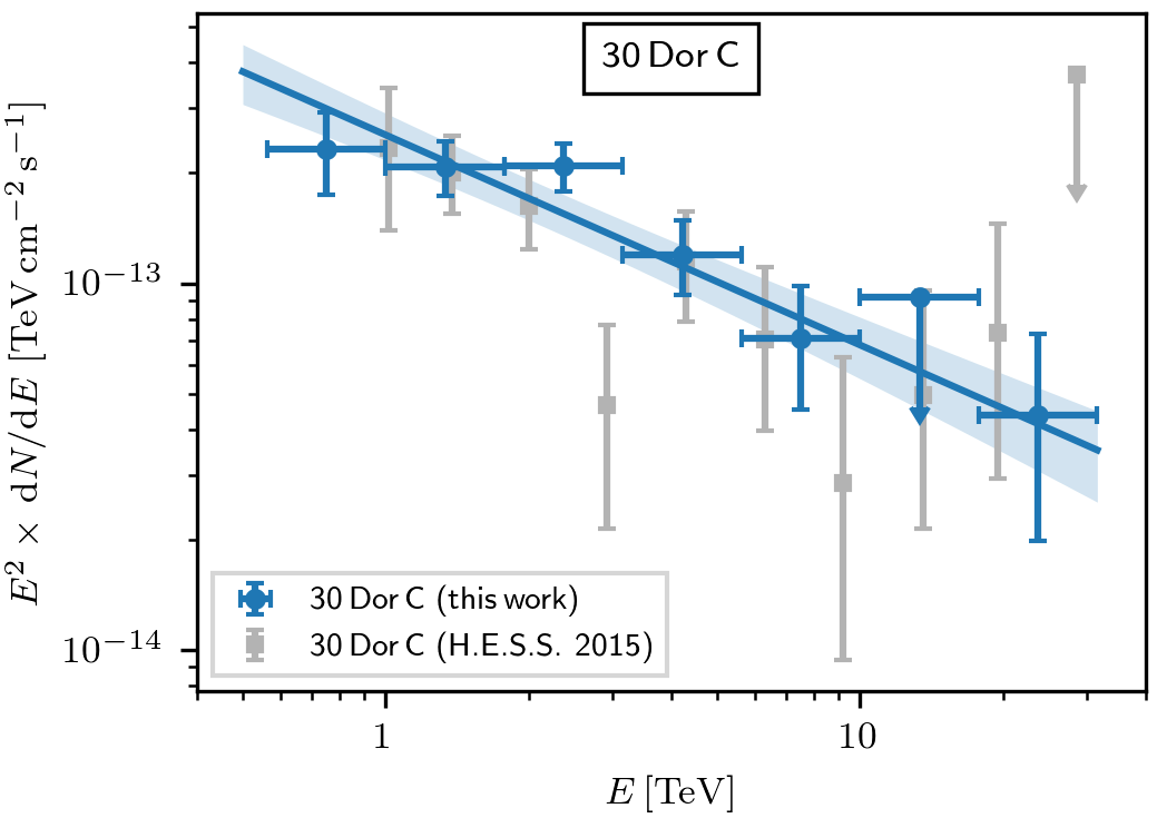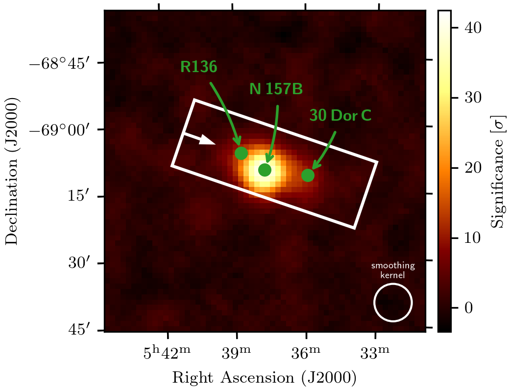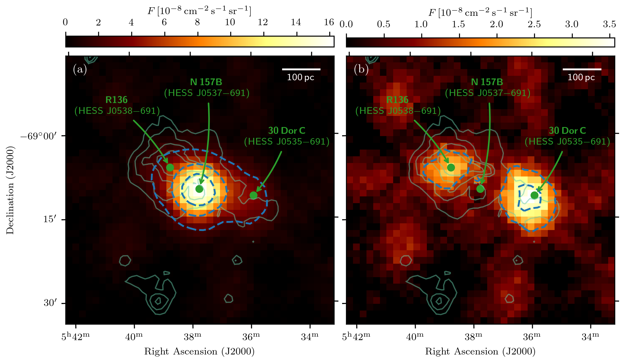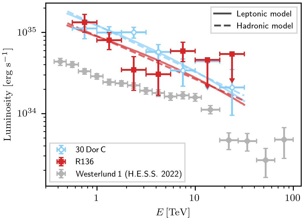 The Tarantula Nebula in the Large Magellanic Cloud is known for its high star formation activity. At its center lies the young massive star cluster R136, providing a significant amount of the energy that makes the nebula shine so brightly at many wavelengths. Recently, young massive star clusters have been suggested to also efficiently produce very high-energy cosmic rays, potentially beyond PeV energies. Here, we report the detection of very-high-energy γ-ray emission from the direction of R136 with the High Energy Stereoscopic System, achieved through a multicomponent, likelihood-based modeling of the data. This supports the hypothesis that R136 is indeed a very powerful cosmic-ray accelerator. Moreover, from the same analysis, we provide an updated measurement of the γ-ray emission from 30 Dor C, the only superbubble detected at TeV energies presently. The γ-ray luminosity above 0.5 TeV of both sources is (2–3) × 1035 erg s−1. This exceeds by more than a factor of 2 the luminosity of HESS J1646−458, which is associated with the most massive young star cluster in the Milky Way, Westerlund 1. Furthermore, the γ-ray emission from each source is extended with a significance of >3σ and a Gaussian width of about 30 pc. For 30 Dor C, a connection between the γ-ray emission and the nonthermal X-ray emission appears likely. Different interpretations of the γ-ray signal from R136 are discussed.