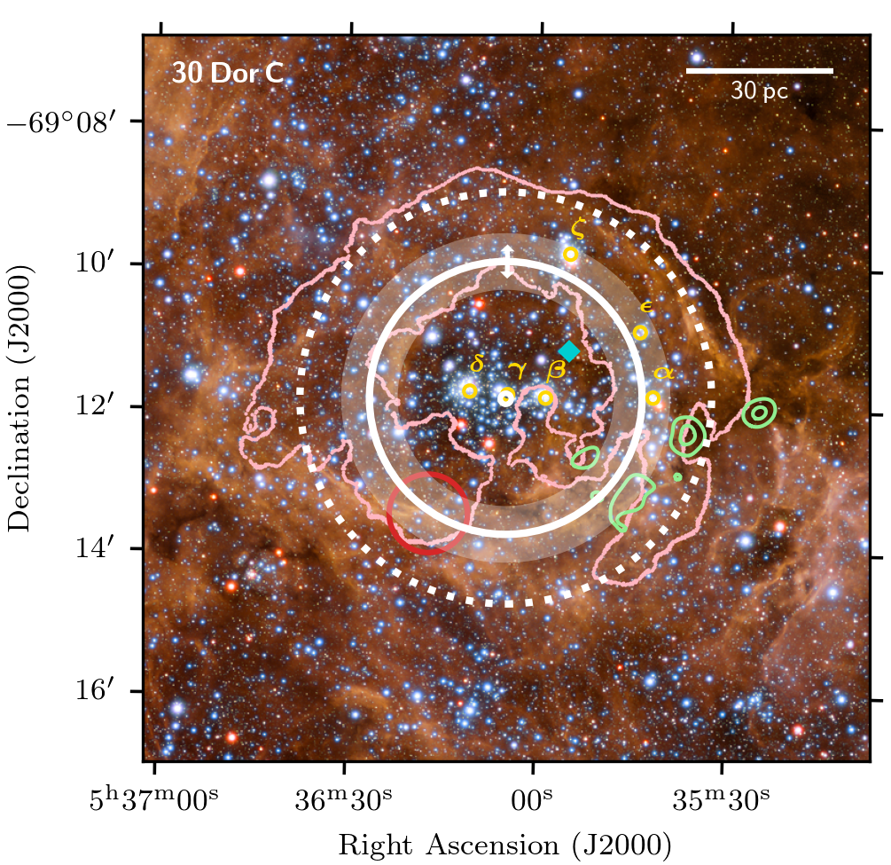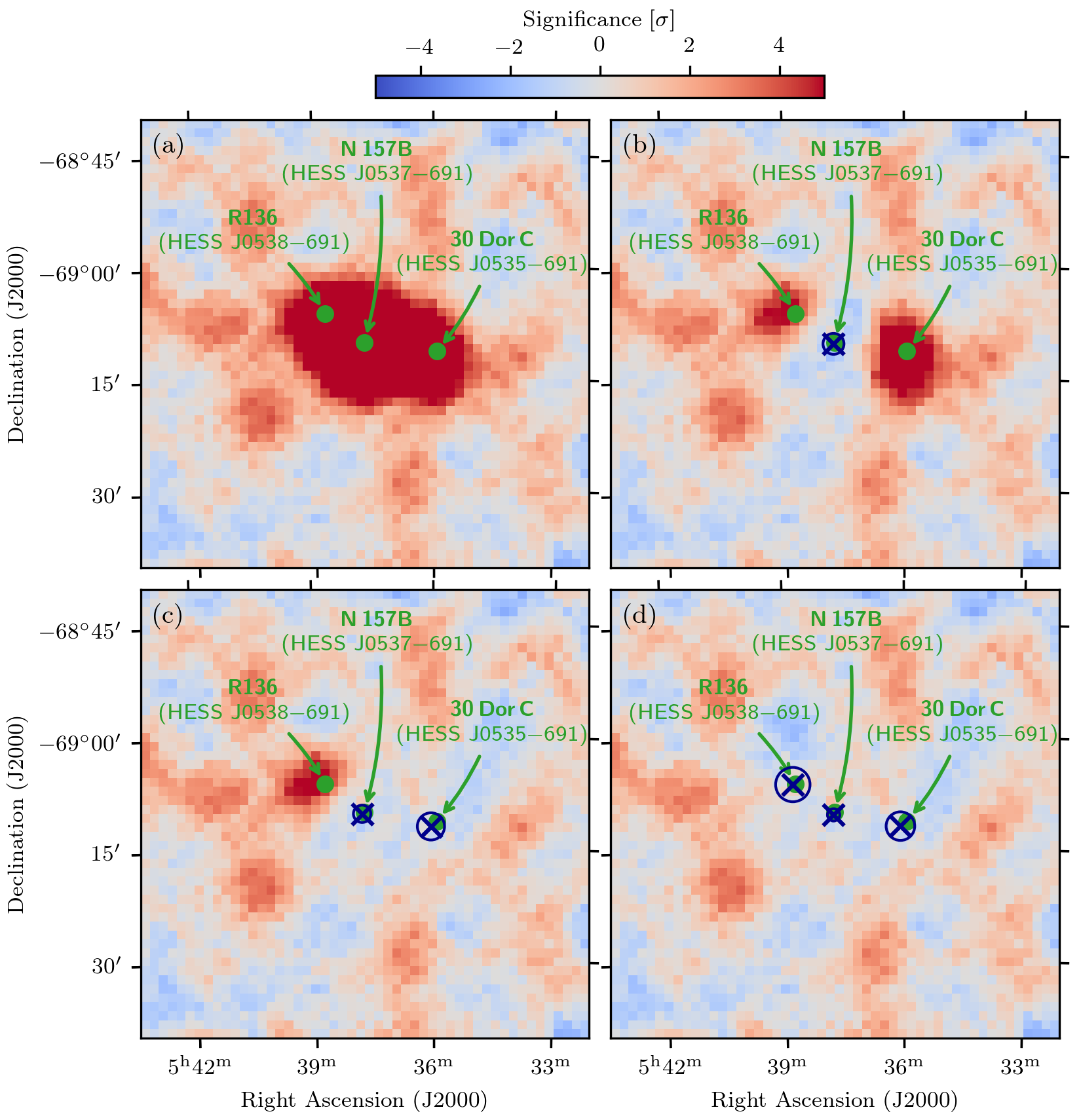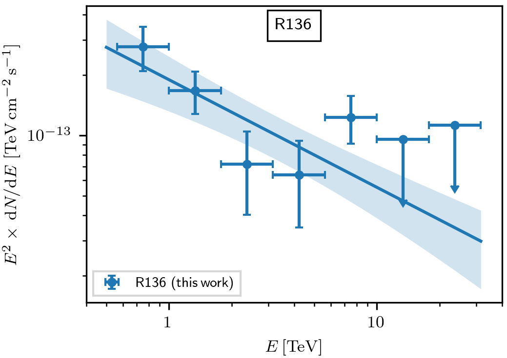 The Tarantula Nebula in the Large Magellanic Cloud is known for its high star formation activity. At its center lies the young massive star cluster R136, providing a significant amount of the energy that makes the nebula shine so brightly at many wavelengths. Recently, young massive star clusters have been suggested to also efficiently produce very high-energy cosmic rays, potentially beyond PeV energies. Here, we report the detection of very-high-energy γ-ray emission from the direction of R136 with the High Energy Stereoscopic System, achieved through a multicomponent, likelihood-based modeling of the data. This supports the hypothesis that R136 is indeed a very powerful cosmic-ray accelerator. Moreover, from the same analysis, we provide an updated measurement of the γ-ray emission from 30 Dor C, the only superbubble detected at TeV energies presently. The γ-ray luminosity above 0.5 TeV of both sources is (2–3) × 1035 erg s−1. This exceeds by more than a factor of 2 the luminosity of HESS J1646−458, which is associated with the most massive young star cluster in the Milky Way, Westerlund 1. Furthermore, the γ-ray emission from each source is extended with a significance of >3σ and a Gaussian width of about 30 pc. For 30 Dor C, a connection between the γ-ray emission and the nonthermal X-ray emission appears likely. Different interpretations of the γ-ray signal from R136 are discussed.