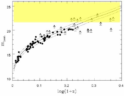 February 2006 “Hubble diagram” for host galaxies of BL Lac objects, showing apparent magnitude versus redshift (Sbarufatti et al, 2005). The diagram can be used to estimate unknown redshifts if the brightness of the…