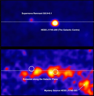 March 2006 Top: TeV gamma rays from the Galactic Center region show two prominent point sources, one located right at the Galactic Center (see also December 2004) and one about a degree away, coincident…